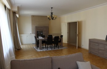 Ixelles/proximité Abbaye de la Cambre, superbe appartement meublé de 161m² (PEB) rénové avec soin comprenant : vaste hall d'entrée, wc séparé, living de 58m² sur parquet, grande cuisine hyper équipée avec coin à déjeuner, hall de nuit, salle de bains et salle de douche, 3 chambres de 16-12 et 9m², balcon et petite terrasse, garage. Appartement spacieux et lumineux! 3200 + 300 de charges (provision pour eau chaude, chauffage et communs). PEB C.